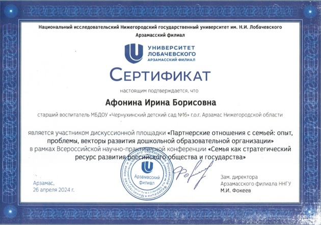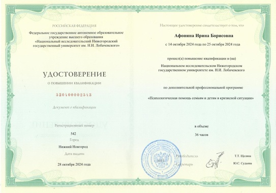 19) Национальный исследовательский Нижегородский государственный университет им.Н.И.Лобачевского по программе "Психологическая помощь семьям и детям в кризисной ситуации" (36 часов), 2024 г.