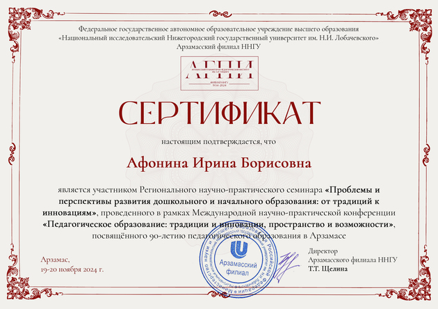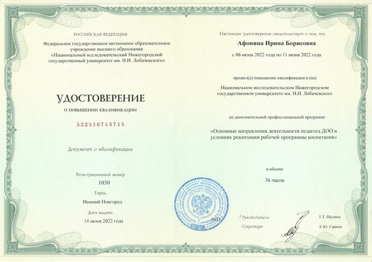 9)Национальный исследовательский Нижегородский государственный университет им.Н.И.Лобачевского по программе "Основные направления деятельности педагога ДОО в условиях реализации рабочей программы воспитания" (36 часов), 2022 г.