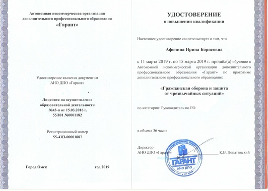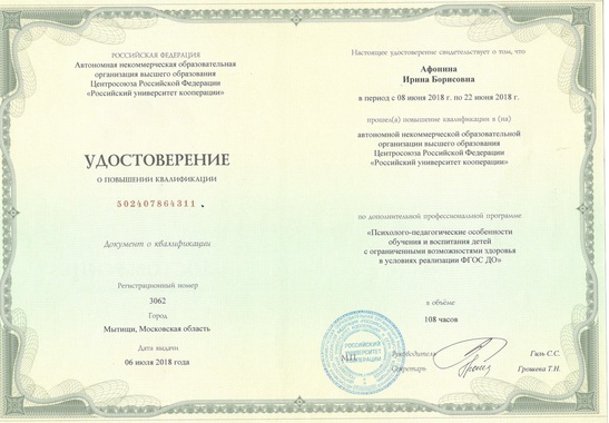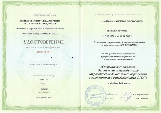 1) Общество с ограниченной ответственностью "Учебный центр ПРОФЗНАНИЯ" по программе дополнительного профессионального образования; "Старший воспитатель. Организация и методическое сопровождение дошкольного образования в соответствии с требованиями ФГОС" (108 часов) 2020г.