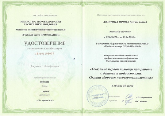 2) Общество с ограниченной ответственностью "Учебный центр ПРОФЗНАНИЯ" по программе дополнительного профессионального образования "Оказание первой помощи при работе с детьми и подростками. Охрана здоровья несовершеннолетних" (36 часов) 2020г.