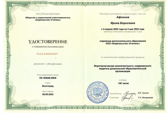 7)Общество с ограниченной ответственностью "Издательство "Учитель" по программе дополнительной профессиональной программе "Игротехническая компетенстность современного педагога дошкольной образовательной организации" (140 часов) 2022 г.