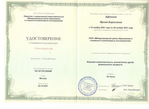 4)Общество с ограниченной ответственностью "Международный центр образования и социально-гуманитарных исследований" по дополнительной профессиональной программе "Игровая компетентность воспитателя детей дошкольного возраста" (36 часов) 2021г.