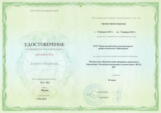 15) ООО "Межреспубликанский институт повышения квалификации и переподготовки кадров при Президиуме ФРО" по программе "Расширенный курс: Методики, практики, компетенции педагога дошкольного образования 2023/2024 для реализации ФОП ДО, ФГОС ДО и методических рекомендаций Минпросвещения в целях успешного воспитания и развития детей на всех этапах дошкольного детства" (216 часов), 2023 г.