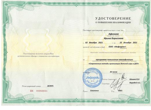 5)Общество с ограниченной ответственностью "Инфоурок" по программе повышения квалификации "Современные методы организации детской игры в ДОУ" (36 часов) 2021 г.