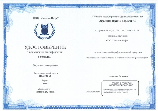 18) ООО "Учитель-Инфо" по программе "Оказание первой помощи в образовательной организации" (36 часов), 2024г.