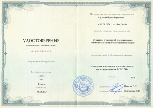16) ООО "Региональный центр повышения квалификации" по программе "Проектная деятельность в детском саду как средство реализации ФГОС ДО" (72 часа), 2024 г.