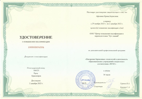 14) ООО "Центр повышения квалификации и переподготовки "Луч знаний" по программе "Внедрение бережливых технологий в деятельность образовательных учреждений и педагогов в соответствии с ФГОС" (36 часов), 2023 г.