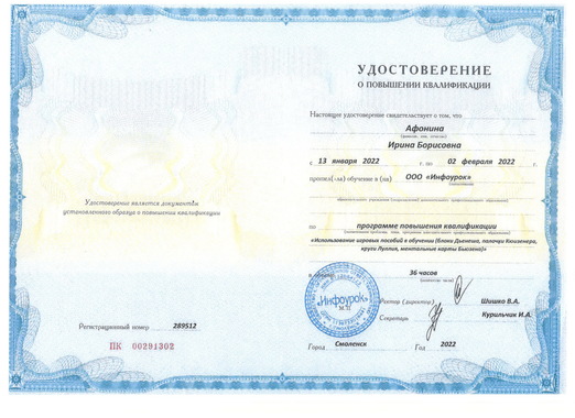 6)Общество с ограниченной ответственностью "Инфоурок" по программе повышения квалификации "Использование игровых пособий в обучении (блоки Дьенеша, палочки Кюизенера, круги Луллия, ментальные карты Бьюзена)" (36 часов) 2022 г.