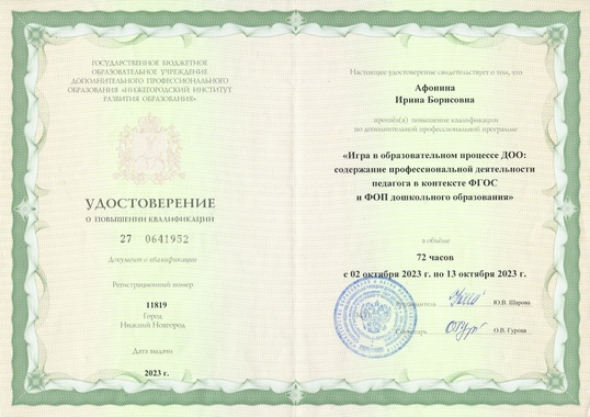 12) ГБОУ ДПО "Нижегородский институт развития образования" по программе "Игра в образовательном процессе ДОО: содержание профессиональной деятельности педагога в контексте ФГОС и ФОП дошкольного образования" (72 часа), 2023 г.