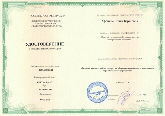 22) ООО "Профессиональная элита" по программе "Технология проектной деятельности в образовательный процесс дошкольного образовательного учреждения" (72 часа), 2025 г.