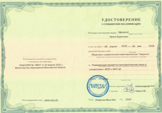 24)ООО "Карусель" "Развивающая предметно-пространственная среда в соответствии с ФГОС и ФОП ДО" (72 часа), 2025г.