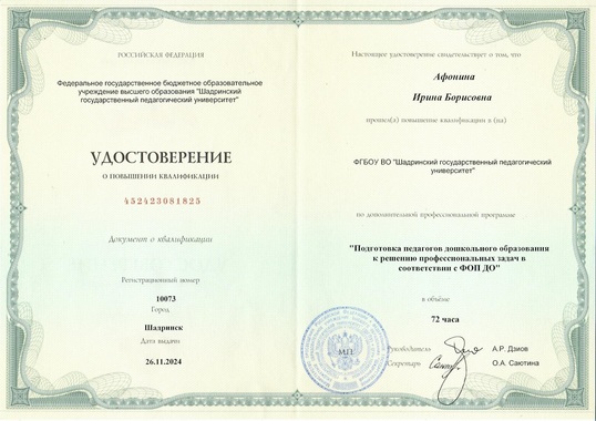 21) ФГБОУ ВО "Шадринский государственный педагогический университет" по программе "Подготовка педагогов дошкольного образования к решению профессиональных задач в соответствии с ФОП ДО" (72 часов), 2024 г.