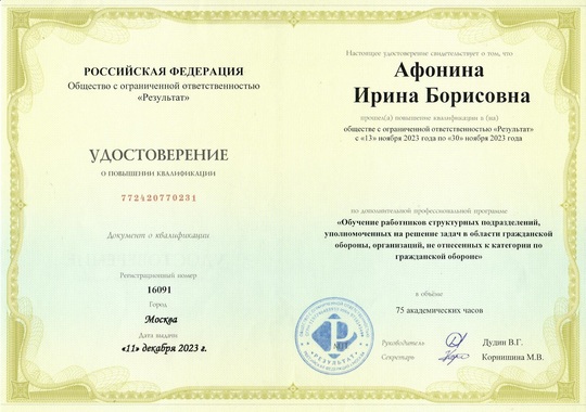 13) ООО "Результат" по программе "Обучение работников структурных подразделений, уполном оченных на решение задач в области гражданской обороны, организаций, не отнесенных к категории по гражданской обороне" (75 часов), 2023 г.
