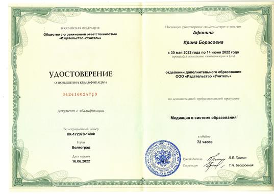 8)Общество с ограниченной ответственностью "Издательство "Учитель" по программе дополнительной профессиональной программе "Медиация в системе образования" (72 часа) 2022г.