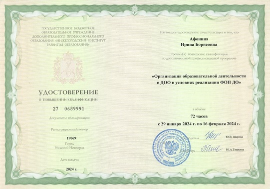 17) ГБОУ ДПО "Нижегородский институт развития образования" по программе "Организация образовательной деятельности в ДОО в условиях реализации ФОП ДО" (72 часа), 2024 г.