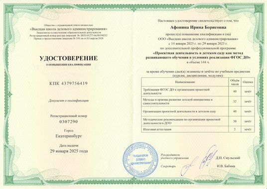 23) ООО "Высшая школа делового администрирования" по программе "Проектная деятельность в детском саду как метод развивающего обучения в условиях реалиции ФГОС ДО" (144 часов), 2025 г.